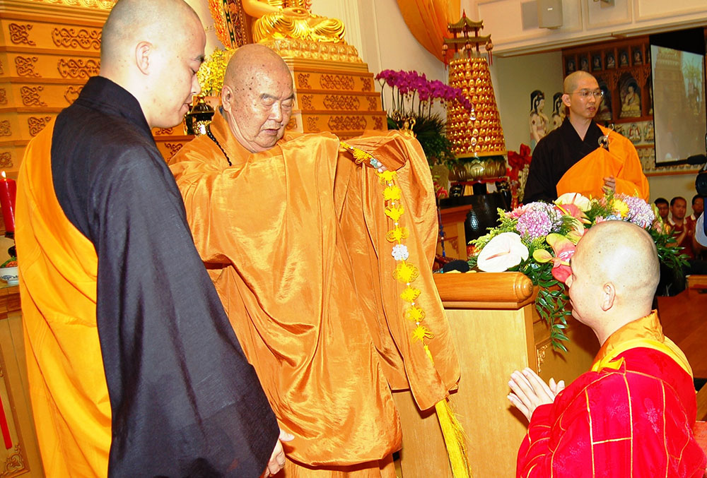 The ceremony officially began with the rolling of the drum. Venerable Master Hsing Yun read the Dharma Scripture, and personally bestowed the sacred robe and auspicious object, a ritual signifying the transferring of the “Dharma Flow” and responsibilities. Then Venerable Long Xiang sworn in, that he will embrace his teacher’s will to promote Buddhism to benefit all sentient beings. Following the Dharma Choir, all witnesses started singing “the Praise of the Sangha” to congratulate Venerable Long Xiang. Venerable Master Hsing Yun said that Chung Mei Temple is strategically placed in the U.S. Central area to become the center of cultural exchanges between Buddhism and Western society, presenting a harmonious blend of people with different languages and social backgrounds.